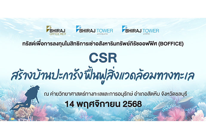 เมื่อวันที่ 14 พฤศจิกายน 2568 ทางผู้จัดการกองทรัสต์ และผู้บริหารอสังหาริมทรัพย์ ร่วมพลังผู้เช่าอาคารอาคารภิรัชทาวเวอร์ แอท เอ็มควอเทียร์ และ อาคารภิรัชทาวเวอร์ แอท ไบเทค จำนวน 40 ท่าน จากหลากหลายบริษัท มาร่วมกันทำความดีในกิจกรรม CSR ฟื้นฟูท้องทะเลไทย กับกิจกรรม “สร้างบ้านปะการังฟื้นฟูสิ่งแวดล้อมทางทะเล” ณ ค่ายวิทยาศาสตร์ทางทะเลและการอนุรักษ์ อ.สัตหีบ จ.ชลบุรี รวมทั้งร่วมกันทำกิจกรรมเก็บขยะ และคัดแยกขยะ ที่ชายหาดนางรำ กิจกรรมที่จัดขึ้นนี้สะท้อนถึงความมุ่งมั่นด้าน ESG ขององค์กร เพื่อปกป้อง ฟื้นฟูระบบนิเวศ และสิ่งแวดล้อมอย่างยั่งยืน