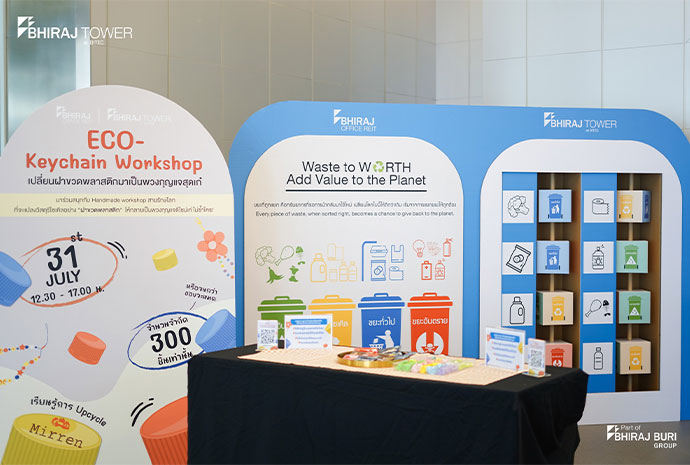 กิจกรรมที่เชิญชวนผู้เช่าอาคารภิรัชทาวเวอร์ แอท เอ็มควอเทียร์ และผู้เช่าอาคารภิรัชทาวเวอร์ แอท ไบเทค ร่วมรักษาสิ่งแวดล้อม เปลี่ยนฝาขวดพลาสติกให้กลายมาเป็นพวงกุญแจผ่านการ workshop พร้อมเรียนรู้เรื่องความยั่งยืน การรีไซเคิลขยะพลาสติก และได้พวงกุญแจที่ทำขึ้นเองจากวัสดุรีไซเคิลกลับไปใช้